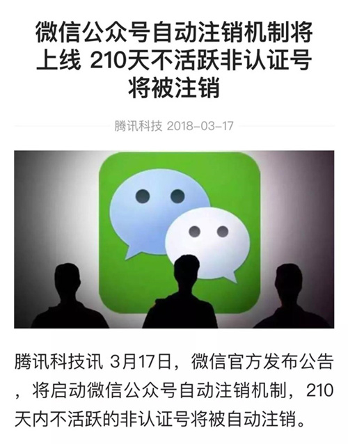 微信公众号自动注销机制即将上线,210 天内不活跃的非认证公众帐号将会被自动注销。将直接改善其占用用户以及平台的昵称和微信号等资源的情况,满足各位小伙伴对长时间不使用帐号注销的需要。